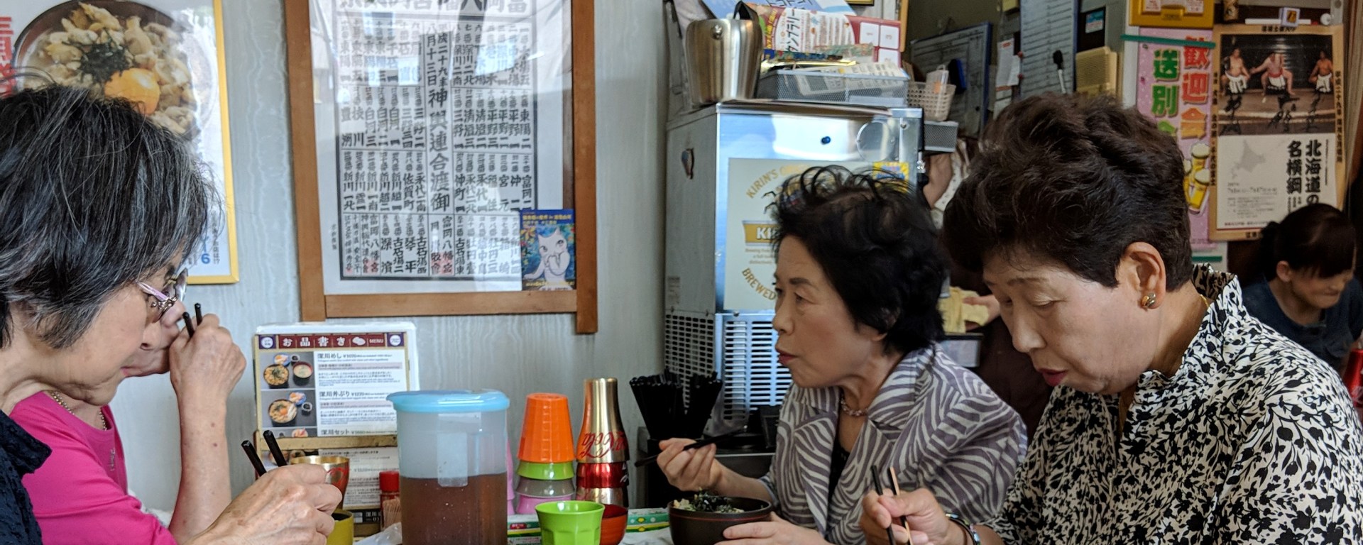 照片中的四位女性長者,是我們在清澄白河一間老店遇到的,她們在一個平日的中午,相約去吃個有點回憶的料理。雖然聽不懂日文,但感覺這些姊妹就是定期聚會,聊聊生活中的點滴。途中,因為我家小孩被湯燙到,她們還非常的關心,想要知道孩子有沒有燙傷。