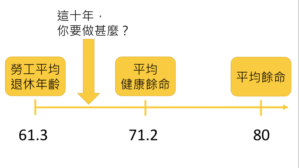 以台灣的現狀來說,平均退休年齡大概是62歲左右,健康平均餘命是71歲左右,平均餘命是80歲左右。也就是說,退休後的人,有將近十年的時間,是夠健康的。如果沒有妥善規劃這十年要做些什麼,其實是非常可惜的。