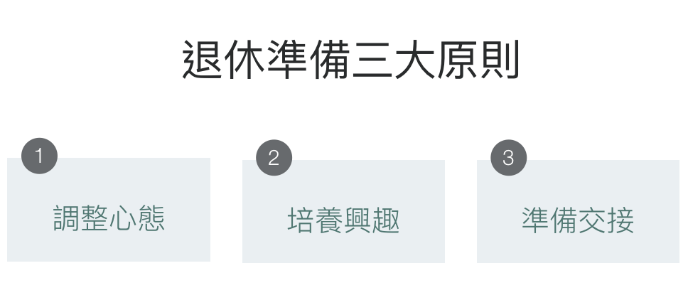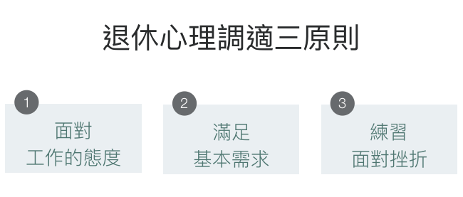 - 滿足自己的基本心理需求:人們基本的心理需求有三個,分別是自主性、影響力以及連結性。自主性指的就是,一個人有選擇權,可以決定自己想要什麼樣的事物。影響力指的就是,你是否有能力影響其他人,也就是所謂的,自己還有沒有用。連結性指的就是,是不是還和家人、社會保有關係,而不是被孤立的。退休很容易伴隨這三個需求的轉變,所以你要提早思考,自己一旦退休後,要怎麼調整,才能確保自己這些需求依舊能夠被滿足,至少不至於到被剝奪的境界。